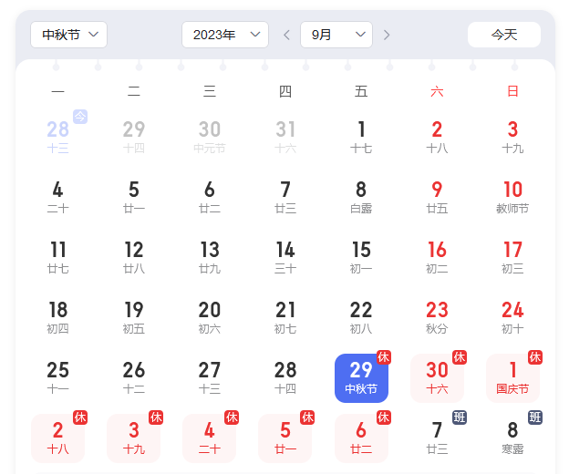 ¥™♣→ 1.中秋節、國(guó)慶節放(fàng)假安排:2023年(nián)9月₩(yuè)29日(rì)-10月(yuè)6日(rì)放(fàn¶Ωg)假調休,共8天。10月(yuè)7日(rì)(星期六)、10月(yφ¥'uè)8日(rì)(星期日(rì))上(shàng)班。